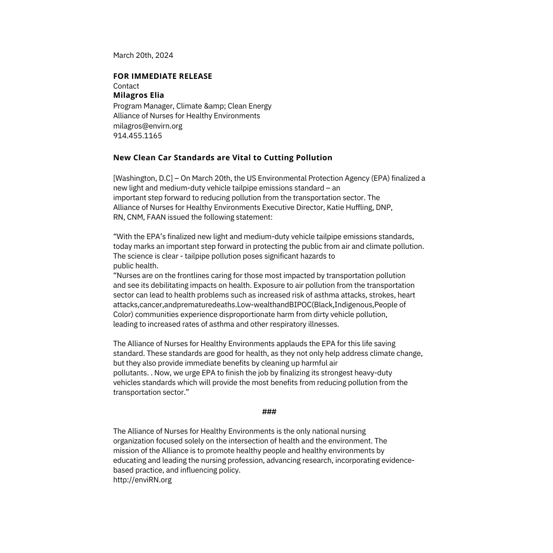 FOR IMMEDIATE RELEASE Contact Jessica Mengistab Program Manager, Climate & Clean Energy Advocacy Alliance of Nurses for Healthy Environments jessica@envirn.org (732) […]